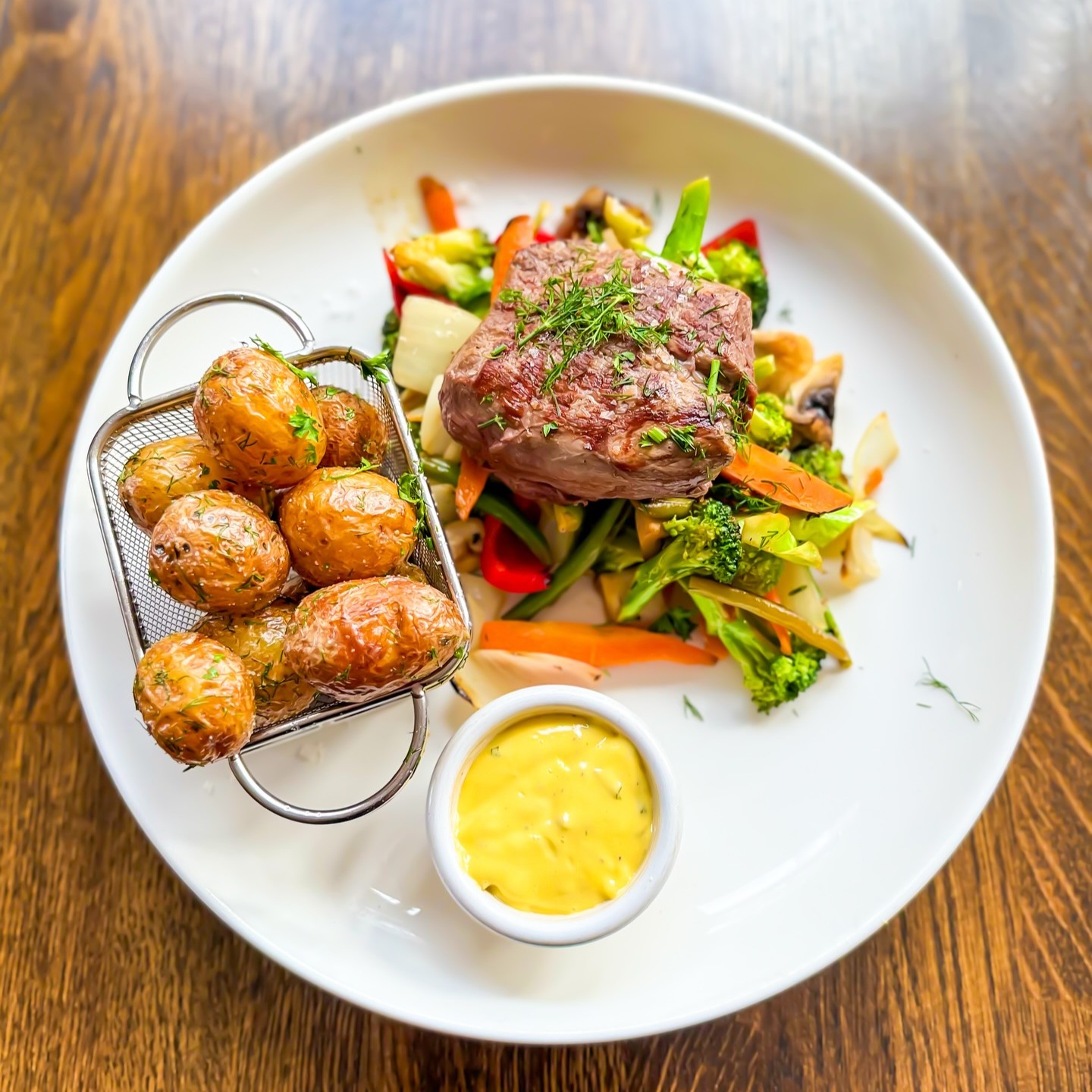 Grillet indrefilet av storfe, sesongens grønnsaker og bearnaisesaus.